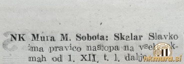 Za Muro je bil registriran vratar Slavko Skalar, ki se je vrnil iz vojakov. Pravico nastopa ima na vseh tekmah od 1. decembra 1951 dalje.