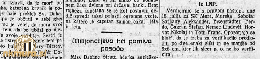 Nogometaši Mure bodo v novo sezono štartali okrepljeni s šestimi novimi igralci. Z 18. julijem 1931 imajo pravico nastopa Aleksander Sarhany, Ferdo Eisenstädter, Štefan Čagran, Ljudevit Nemec, Nikolaj Horvat in Franc Toth.