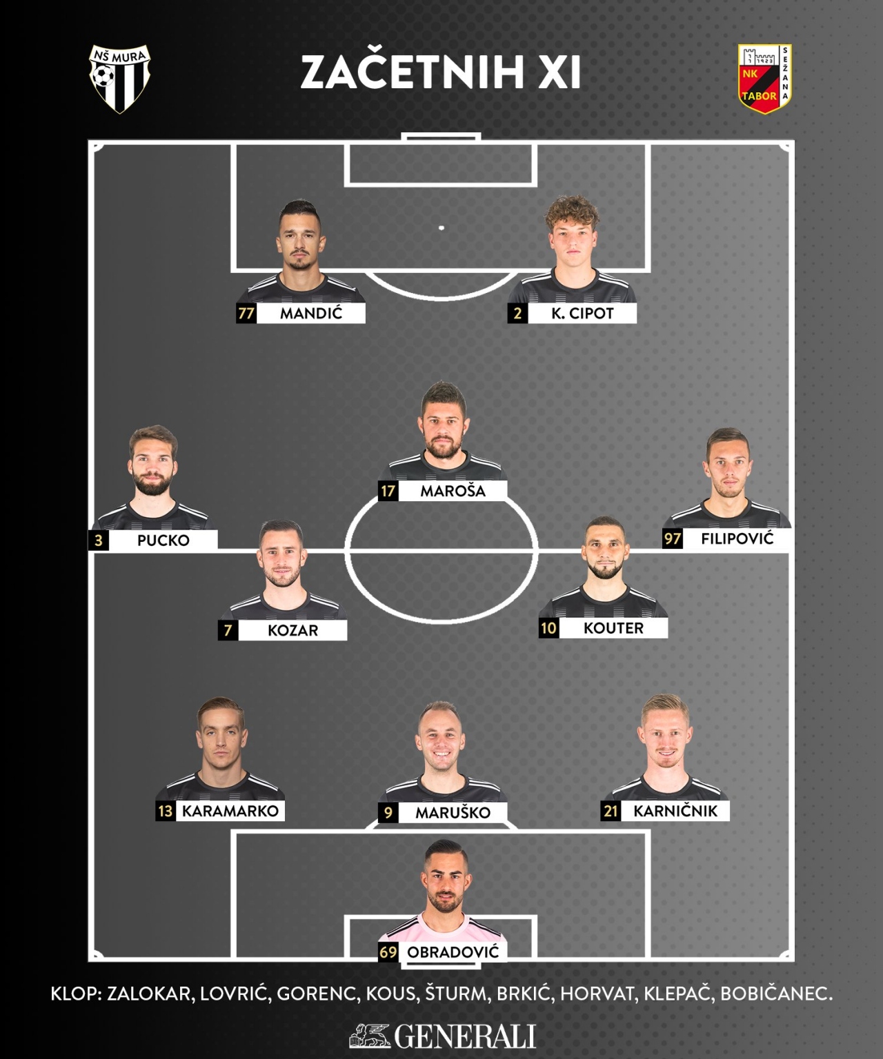 Postava Mure: Obradović - Karamarko, Maruško, Karničnik - Pucko, Kozar (od 59. Horvat), Maroša, Kouter, Filipović (od 46. Kous) - Mandić (od 46. Klepač (od 85. Brkić)) in K. Cipot (od 46. Bobičanec). Trener: Ante Šimundža