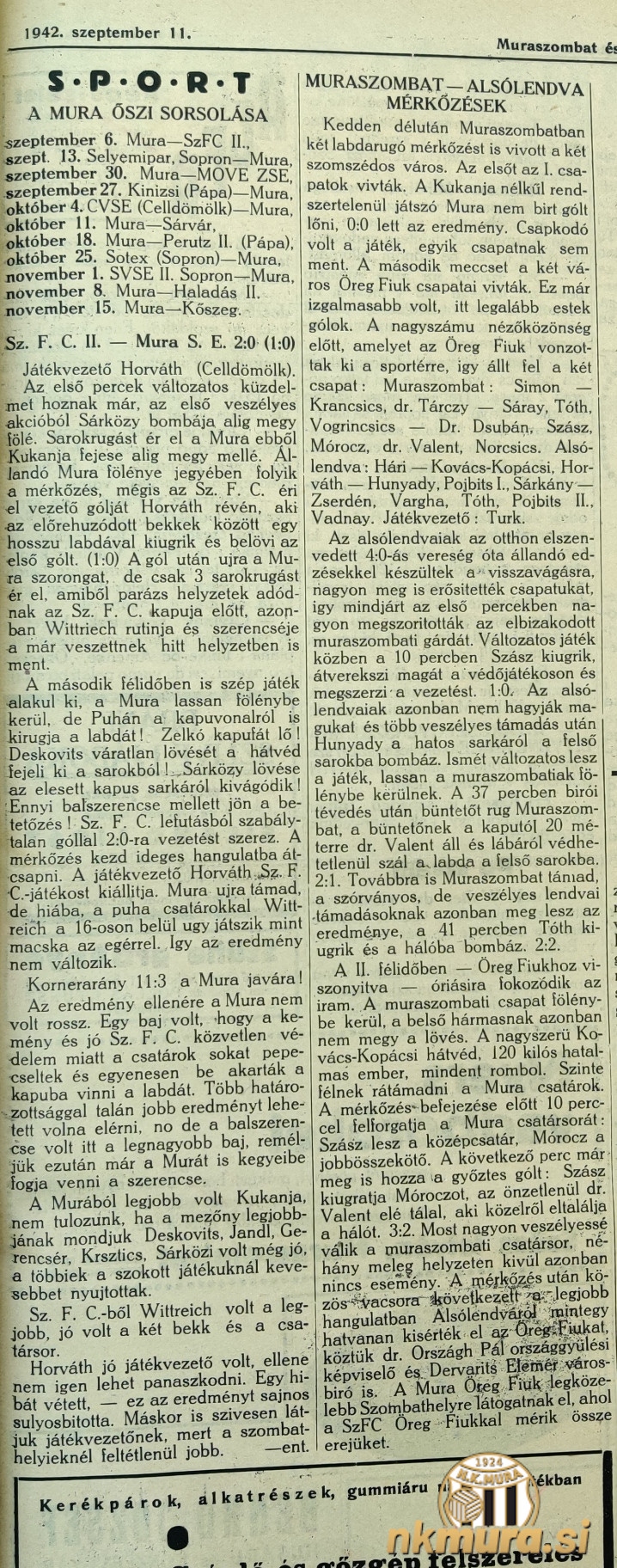 V prvem krogu prvenstva v sezoni 1942/1943, so črno-beli na Fazaneriji gostili drugo ekipo Szombathelyjija in izgubili z 0:2. Polčas se je končal z 0:1.