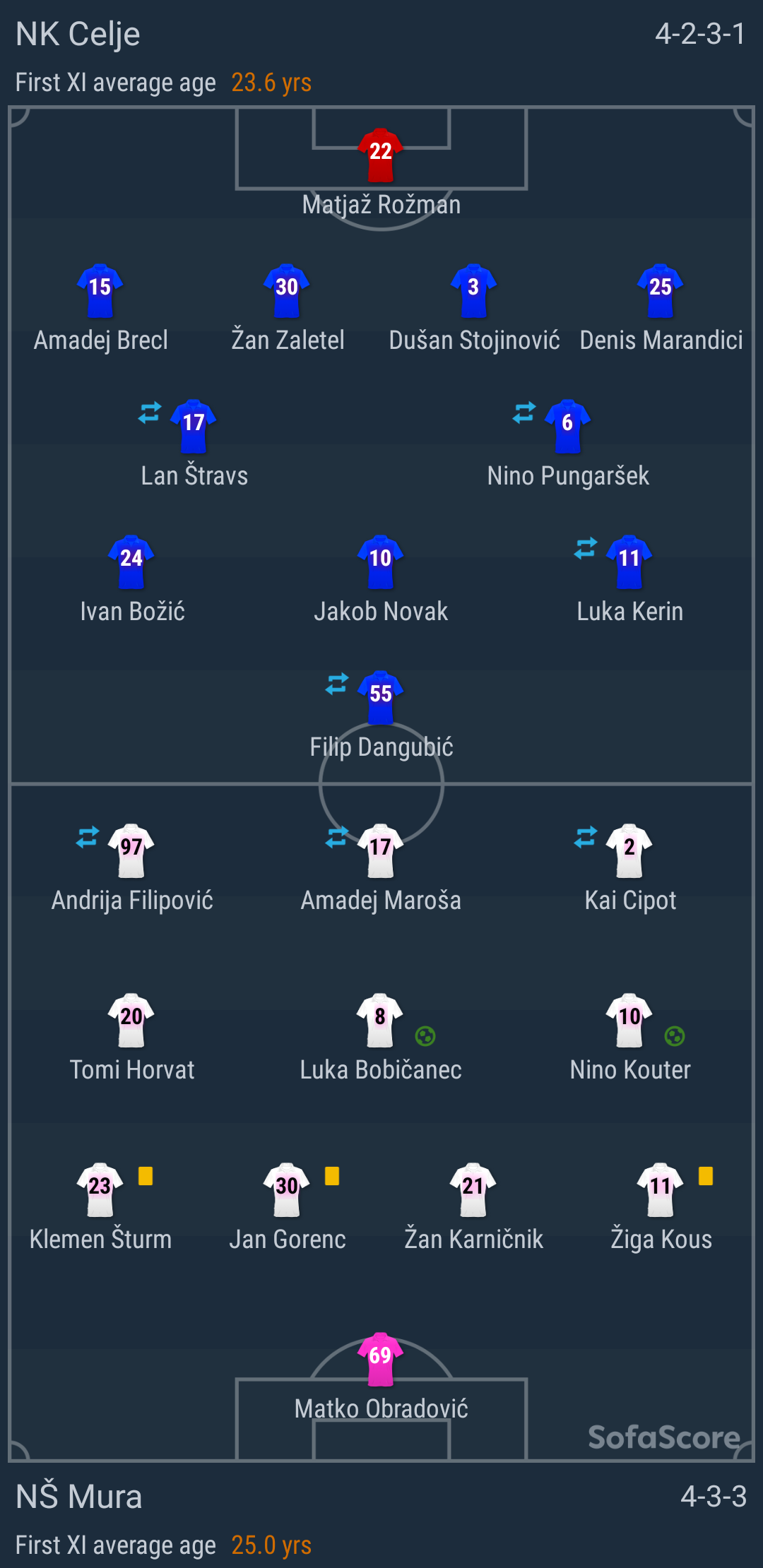 * Celje: Rozman, Stojinović, Pungaršek (od 59. R. Štraus), Novak (od 46. Lotrič), Kerin (od 87. D. Štraus), Brecl, Štravs (od 60. Vrbanec), Božič, Marandici, Zaletel, Dangubić (od 68. Koritnik).