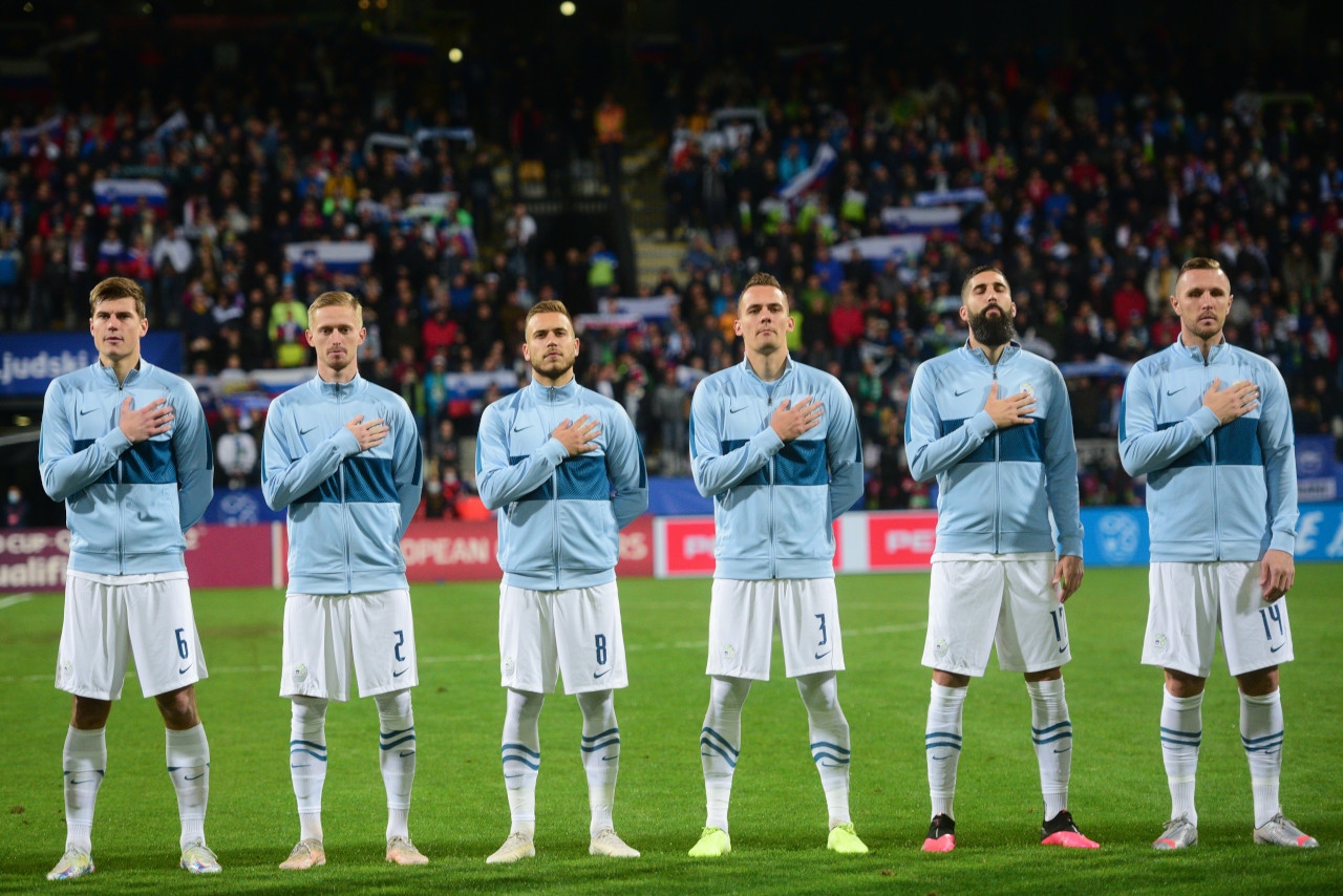 Ob intonaciji državne himne na tekmi Slovenija : Rusija. Žan Karničnik je drugi z leve (številka 2). Foto: nzs.si