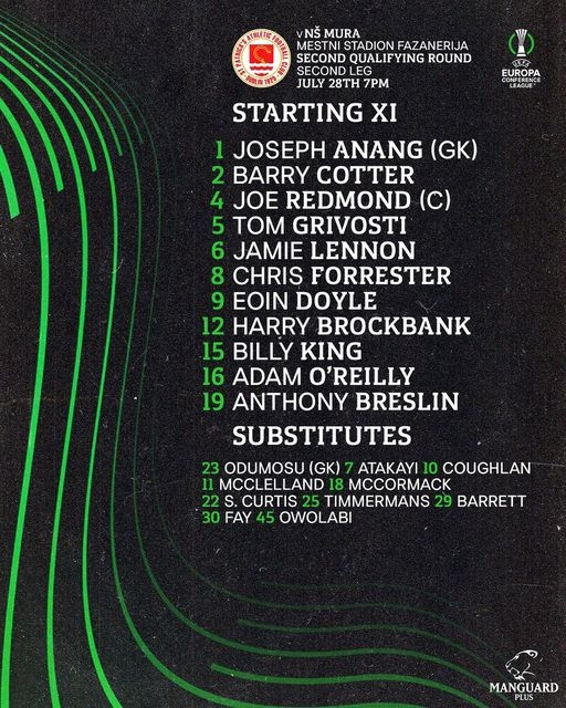 St. Patrick's: Anang, Cotter, Redmond, Grivosti, Breslin, O'Reilly (od 115. McClelland), Brockbank, Lennon (od 62. Timmermmans), Forrester (od 85. Coughlan), Doyle, King (od 69. Atakayi). Trener: Tim Clancy.