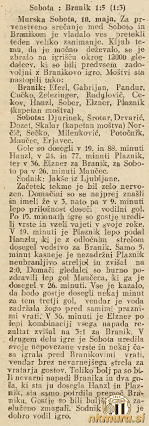 V Murski Soboti je bila v sklopu 18. kroga slovenske republiške lige odigrana tekma med starima rivaloma - Soboto in Branikom. Sobočani so v deževnem vremenu in na blatnem igrišču klonili z 1:5 (1:3).