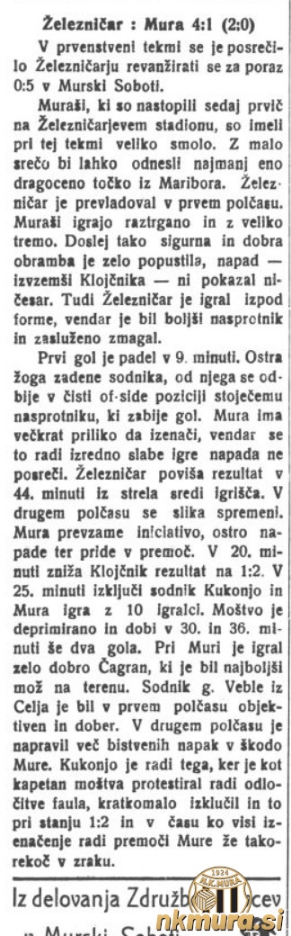 Črno-beli so imeli precej smole, tudi nekaj treme, zatajili pa so še napadalci, ki niso izkoristili danih priložnosti. Prvi zadetek je padel v 9. minuti. Žoga je zadela sodnika, od njega pa se je odbila na noge nasprotnikovemu igralcu, ki je zadel za 1:0. Nato je imela Mura kar nekaj priložnosti, da izid izenači, vendar so napadalci zapravljali preveč priložnosti. Železničar je na 2:0 povišal v 44. minuti s strelom s sredine igrišča.