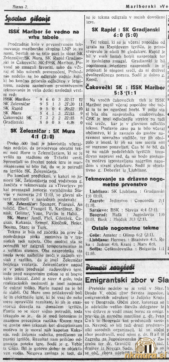 Nogometaši Mure so v 9. krogu prvenstva gostovali v Mariboru pri aktualnih podzveznih prvakih - Železničarju. Derbi kroga je s 4:1 (2:0) dobil Železničar in se tako Muri oddolžil za septembrski poraz v Murski Soboti.