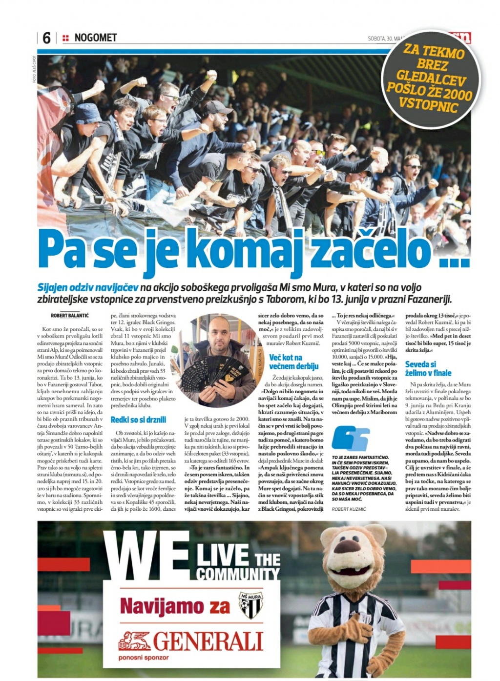 Sobotna izdaja Ekipe (30. maj 2020) prinača na naslovnici vest, da želi Mura preseči Olimpijo in Maribor. V časniku namigujejo na dejstvo, da je bila v Sloveniji tekma z največ prodanimi vstopnicami tista pred štirimi leti, ko sta se v Stožicah pomerila Olimpija in Maribor. Takrat je bilo prodanih 13000 kart, Mura pa bi utegnila to številko preseči. V enem dnevu je namreč pošlo že okrog 2000 kart.
