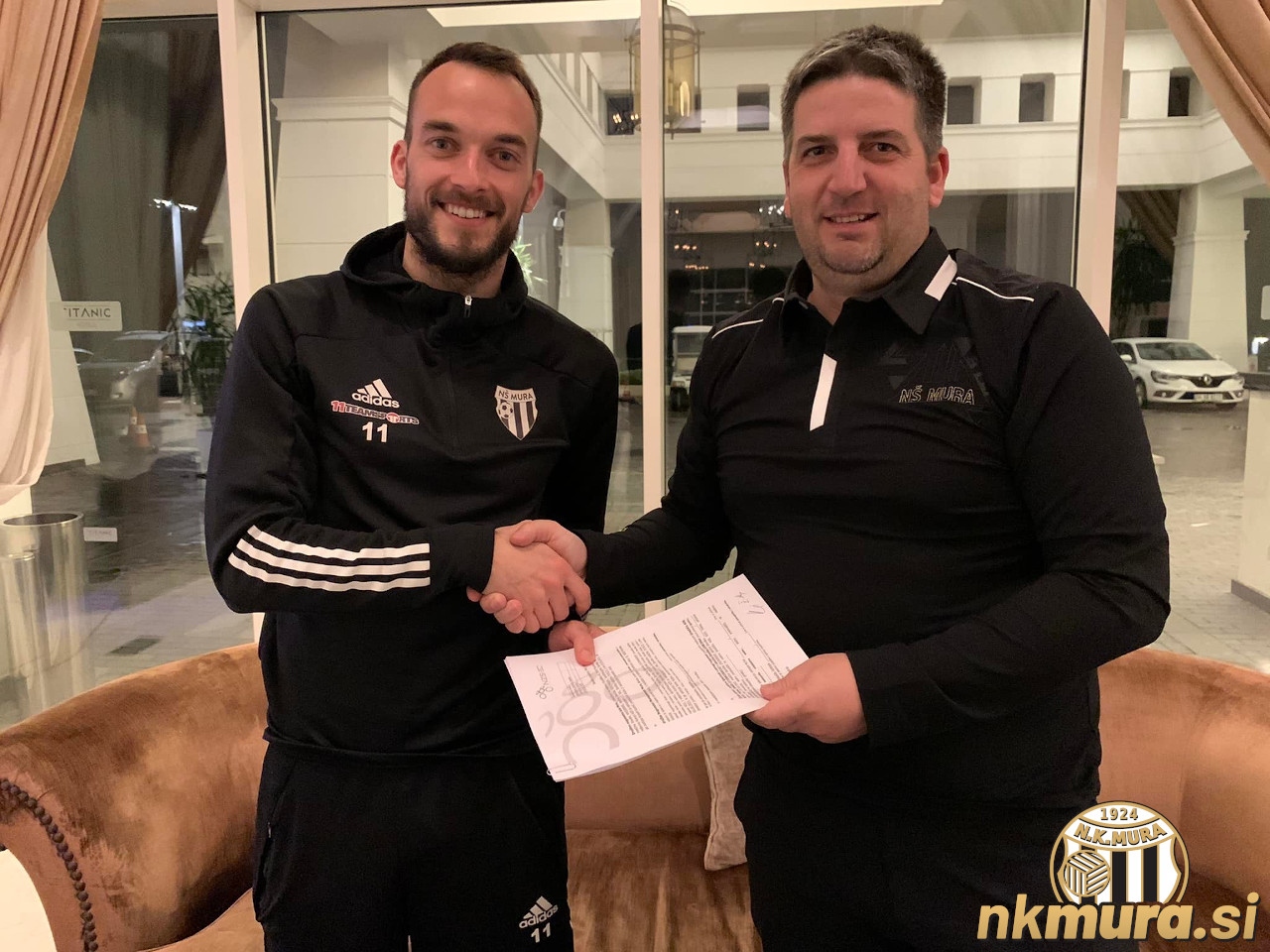 Žiga Kous je podaljšal pogodbo z Muro do 31. maja 2025. Ob njem je športni direktor Denis Rajbar. Avtorske pravice: nkmura.si Foto: NŠ Mura