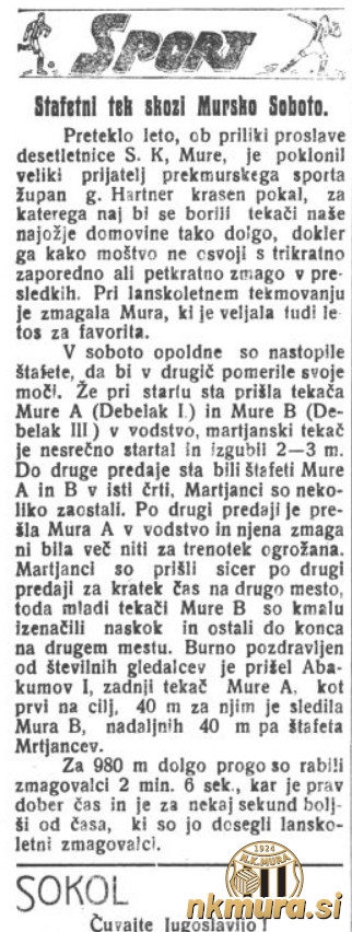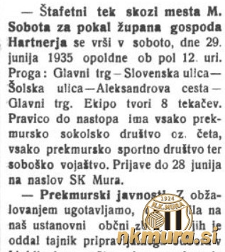 V soboto 29. junija 1935 je skozi mesto potekal drugi štafetni tek za pokal župana Hartnerja. Potekal je po progi: Glavni trg - Slovenska ulica - Šolska ulica - Aleksandrova cesta - Glavni trg. Trasa je bila dolga 980 metrov.