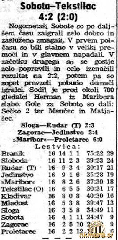 1. Branik 16 14 1 1 75:22 29 2. Sloboda 16 11 2 3 39:23 24 3. Rudar (T) 16 9 3 4 30:17 21 4. Jedinstvo 16 9 1 6 35:28 19 5. Maribor 16 8 2 6 37:30 18 6. Tekstilac (O) 16 6 5 5 30:31 17 7. Kladivar 16 8 0 8 40:30 16 8. Mladost 16 5 3 8 39:47 13 9. Sloga 16 3 5 8 34:49 11 10.Sobota 16 4 1 11 24:47 9 11.Zagorac 16 2 5 10 24:50 9 12.Proletarec 16 2 2 12 16:50 6