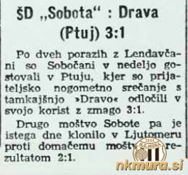 Nogometaši Sobote so po dveh porazih z Lendavčani gostovali na Ptuju, kjer so se pomerili z Dravo. Sobočani so tekmo dobili z 1:3.
