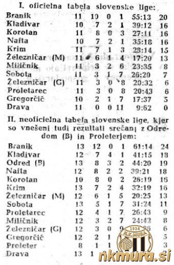 1. Branik 11 10 0 1 55:13 20 2. Kladivar 10 7 2 1 39:12 16 3. Korotan 11 8 0 3 27:11 16 4. Nafta 10 7 2 1 35:18 16 5. Krim 11 7 1 3 28:14 15 6. Železničar MB 11 6 1 4 17:20 13 7. Miličnik 11 3 2 6 23:35 8 8. Sobota 11 3 1 7 26:20 7 9. Železničar GO 11 3 0 8 20:32 6 10.Proletarec 11 3 0 8 20:43 6 11.Gregorčič 10 2 1 7 17:37 5 12.Drava 11 0 0 11 9:62 0