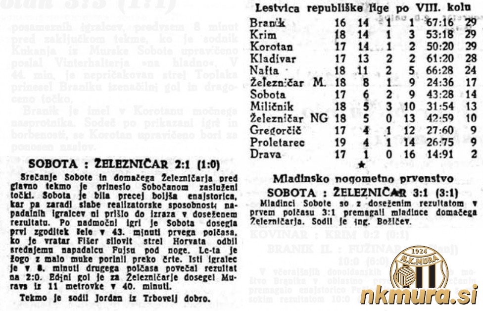 Zmaga Sobote je povsem zaslužena in bi na koncu lahko bila še višja. Prvi zadetek je padel v 43. minuti. Janez Horvat je silovito streljal, vratar Fišer je žogo na kratko odbil do Fujsa, ki jo je brez težav porinil v mrežo za 0:1. Isti igralec je bil znova uspešen v 53. minuti, ko je Sobočane povedel v vodstvo z 0:2. Domačini so častni zadetek dosegli v 85. minuti. Iz enajstmetrovke je bil uspešen Muravs.