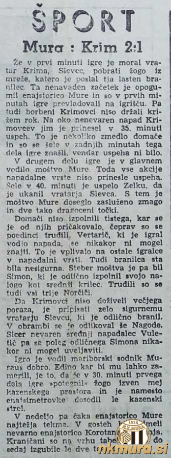 V 18. krogu slovenske republiške lige so nogometaši Mure gostili ljubljanski Krim in zmagali z 2:1 (1:1). Muraši so se z zmago utrdili na šestem mestu.
