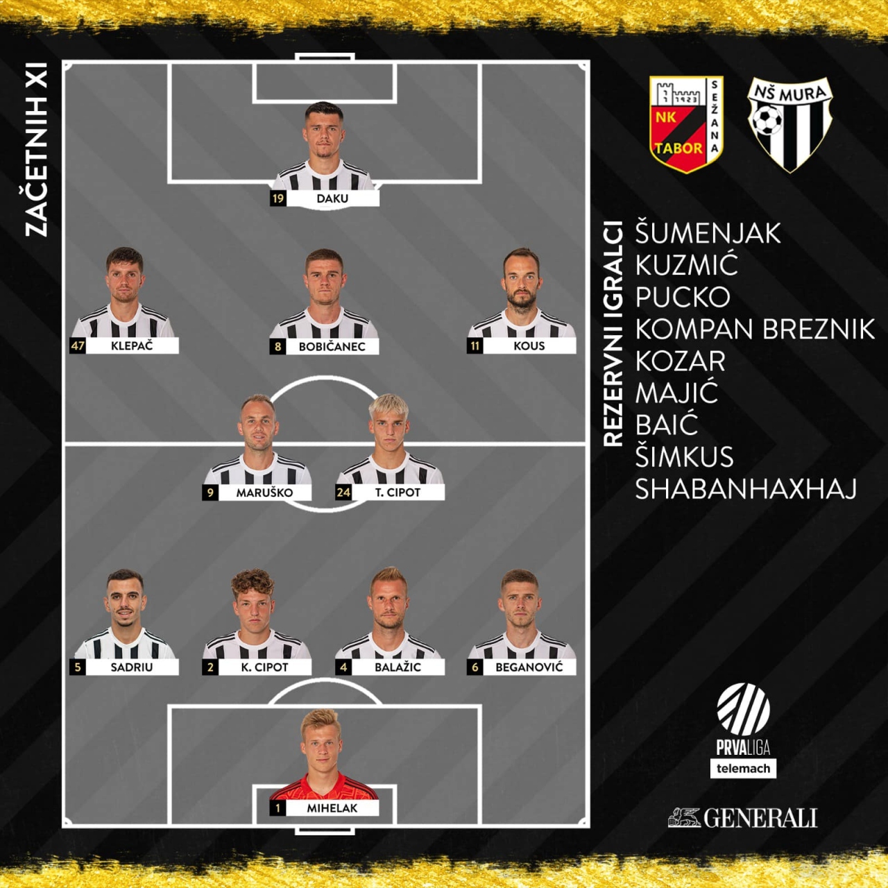 Tabor: Koprivec, Živulić, Ovsenek, Kouao, Letaj, Kaleba (od 46. Stanković), Kocić (od 63. Štravs), Korošec (od 80. Mahne Vatovec), Khali, Hameed (od 46. El Afghani), Nikolić (od 63. Ndzengue). Trener: Dušan Kosič