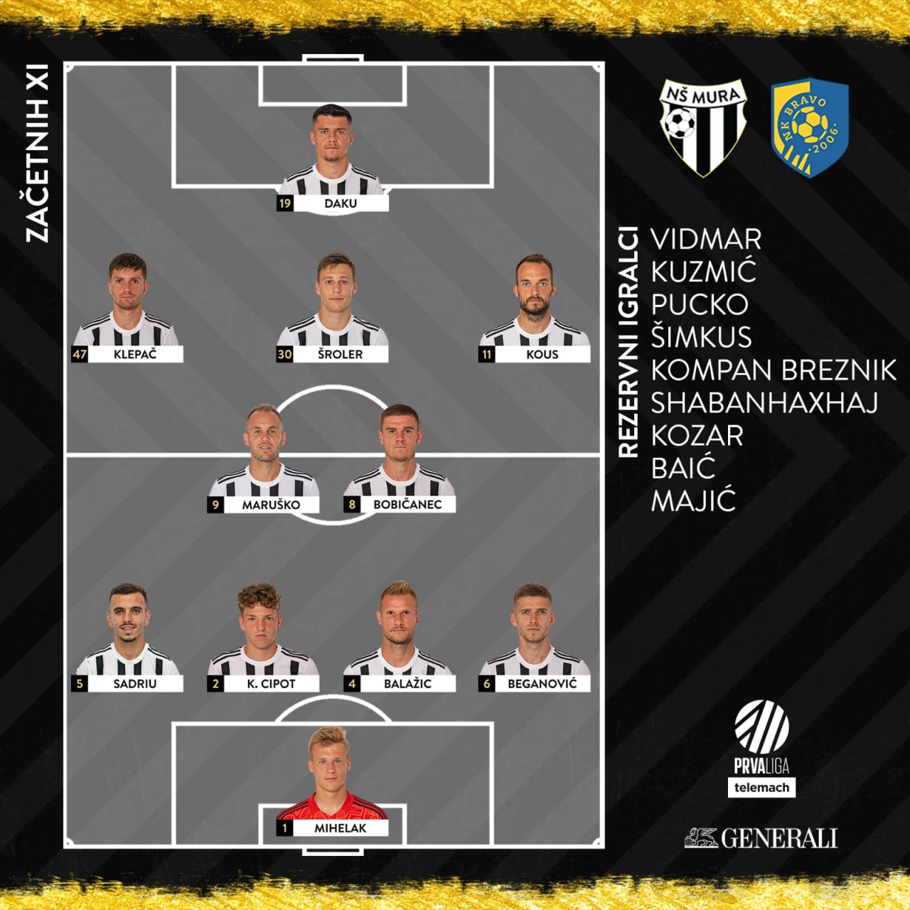 Bravo: Lubej Fink, Jakšić, Kavčič, Kramarič, Križan, Kurtović (od 77. Flakus Bosilj), Milić, Nsana, Štor (od 85. Maružin), Svetlin, Trdin. Trener: Dejan Grabič.