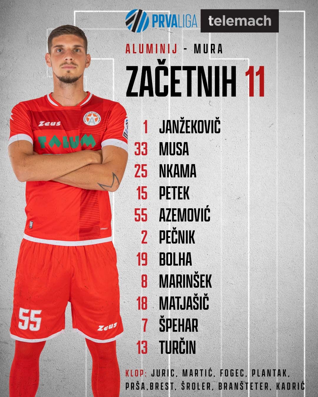Aluminij: Janžekovič, Musa, Nkama, Petek, Azemović (od 77. Branšteter), Pečnik (od 77. Brest), Bolha, Marinšek (od 66. Prša), Matjašič, Špehar (od 86. Kadrić), Turčin (od 66. Šroler). Trener: Oskar Drobne.