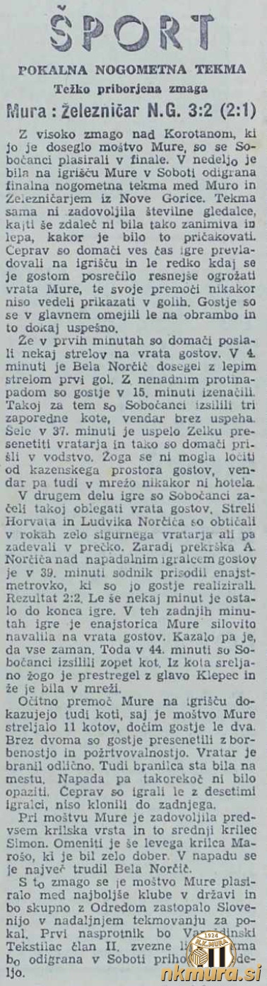 Nogometaši Mure so se z visoko zmago nad Korotanom prebili v finale slovenskega pokala maršala Tita. Tu jih je čakal novogoriški Železničar, ki so ga Sobočani v Murski porazili s 3:2 (2:1). Z zmago so se Muraši drugo leto zapored uvrstili med 64 najboljših klubov v Jugoslaviji, kjer jih čaka varaždinski Tekstilac.