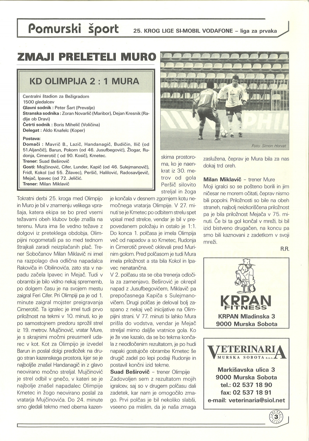 Nogometaši Mure so v 25. krogu lige Si.Mobil Vodafone gostovali pri Olimpiji. Za Bežigradom je bila z 2:1 boljša Olimpija.
