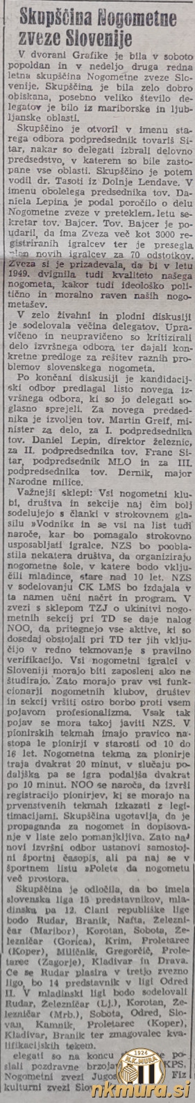 NZS je ustanovila tudi enotno slovensko mladinsko ligo v kateri bo svojega predstavnika imela tudi Sobota. Ligo bo sestavljalo 12 moštev in sicer: Rudar Trbovlje, Železničar Ljubljana, Korotan, Železničar Maribor, Sobota, Odred, Slovan, Kamnik, Proleter Koper, Kladivar, Branik in zmagovalec kvalifikacijskih tekem.