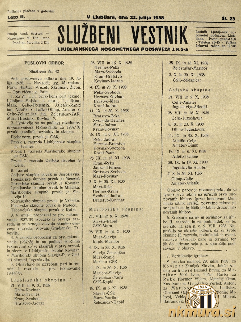 Mura bo prvenstvo pričela 21. avgusta 1938, ko bo gostovala pri lanskoletnem prvaku podzvezne lige ČŠK-ju.
