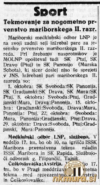 Mariborski medklubski odbor LNP je izžrebal pare za prihajajočo tekmovalno sezono. V Mariborsko - čakovečkem okrožju bo tekmovalo 6 klubov: Svoboda Maribor, Građanski Čakovec, Mura, Ptuj, Panonija Murska Sobota in Drava Ptuj.